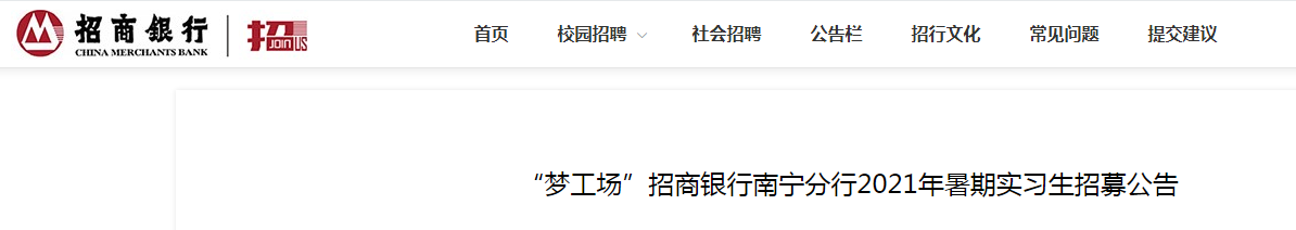 2021年我行将以“梦工场——从心出发,为梦而变”为主题口号打造“梦工场”实习生计划品牌,进一步提升我行雇主品牌影响力,并且强化实习在校园招聘中的前置考察作用,提前锁定优秀毕业生。二、招商银行南宁分行