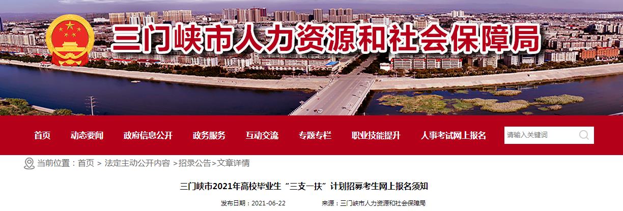 根据中共河南省委组织部、中共河南省委机构编制委员会办公室、河南省人力资源和社会保障厅、河南省财政厅等11部门联合下发的《关于实施第四轮高校毕业生“三支一扶”计划的通知》(豫人社〔2021〕6号)精神、《河南省2021年高校毕业生“三支一扶”计划招募工作方案》(豫人社办函〔2021〕99号)要求,经省“三支一扶”工作协调管理办公室同意,选报三门峡市为服务地的“三支一扶”考生采取网上报名。现将有关事宜通知如下: