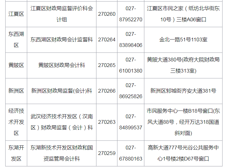 各区会计资格考试管理机构(报名点)代码编号及联系方式