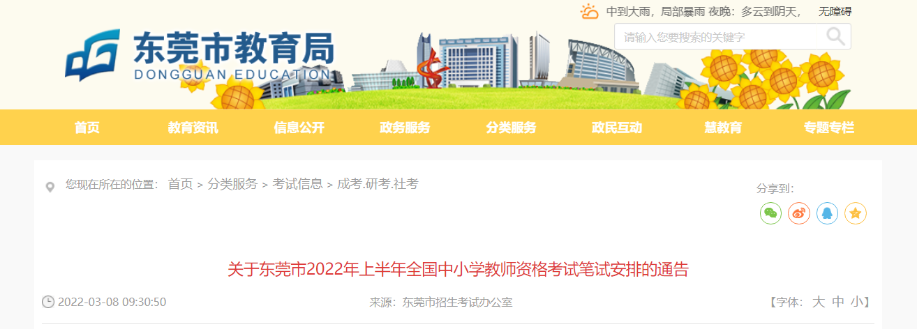 根据我市新冠肺炎疫情防控形势,为保障广大考生和涉考工作人员的健康安全,经研究并请示广东省教育厅同意,现就我市原定于3月12日举行的2022年上半年全国中小学教师资格考试笔试安排通告如下: