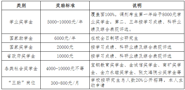 学校设有学业奖学金、国家助学金、国家奖学金、省政府奖学金、各类社会奖学金、研究生“三助”助学金等。非全日制硕士研究生、人事档案未转至我校的全日制硕士研究生不享受奖、助学金。