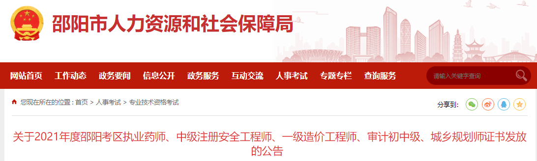 2021年度邵阳考区执业药师、中级注册安全工程师、一级造价工程师、审计初中级、城乡规划师证书即日开始发放。考生可通过手机微信客户端扫描下方二维码,关注“湖南省公务员考试测评中心”服务号,微信发送“手工实名认证”进行实名认证后进入“考生服务”—“我的证书”栏目查询考生本人可领取的资格证书,考生可选择本人现场领取或申请邮寄。