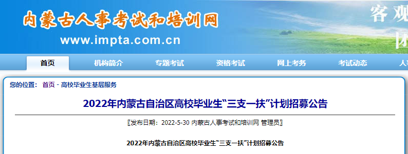 【导语】内蒙古人事考试和培训网发布了《2022年内蒙古自治区高校毕业生“三支一扶”计划招募公告》,©无忧考网从公告中获悉,2022年内蒙古三支一扶报名时间:5月31日-6月6日,考试时间:6月18日,具体事宜详见《招考公告》,小编在此将相关信息摘录如下,预祝大家顺利通过!