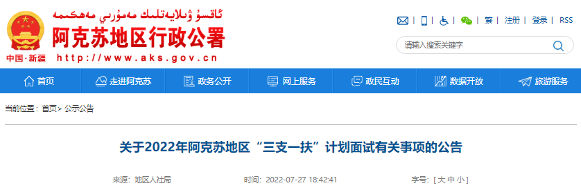6.考生于8月5日,在阿克苏地区政府网、阿克苏招聘网和阿克苏地区人力资源和社会保障局微信公众号查询2022年“三支一扶”面试成绩及总成绩。