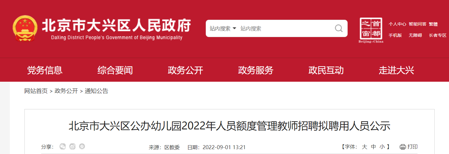 北京市大兴区公办幼儿园2022年人员额度管理教师招聘拟聘用人员名单