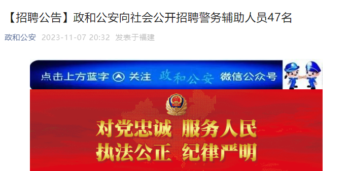 【导语】®无忧考网从政和公安了解到,2023年福建南平政和公安招聘警务辅助人员47人,相关事宜详情如下: