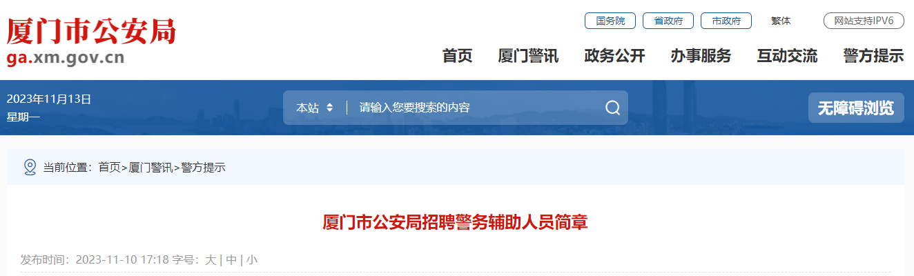 【导语】®无忧考网从厦门人才网获悉,2023年福建厦门市公安局招聘警务辅助人员137人,具体招聘职位、人数、资格条件等详见《职位表》,详情如下:
