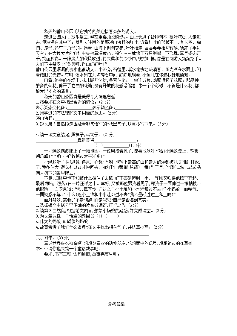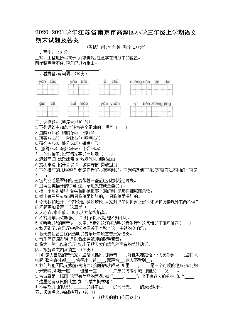 【文档名称】2020-2021学年江苏省南京市高淳区小学三年级上学期语文期末试题及答案(Word版)