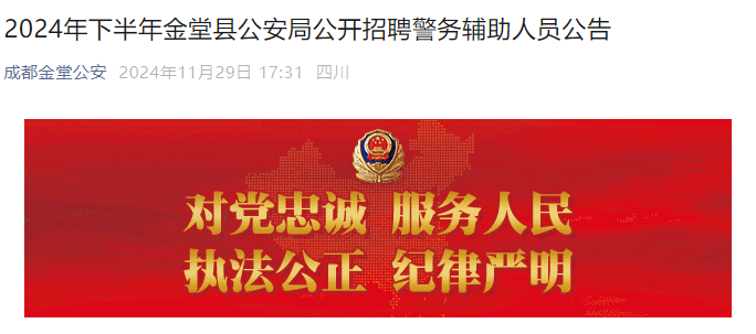 【导语】©无忧考网从成都金堂公安了解到,2024下半年四川成都金堂县公安局公开招聘警务辅助人员30人,相关事宜详情如下: