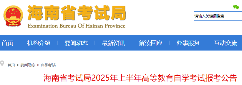 【导语】®无忧考网从海南省考试局了解到,海南2025年上半年高等教育自学考试报考公告已公布,自学考试将于2025年4月12日—13日举行。具体如下:
