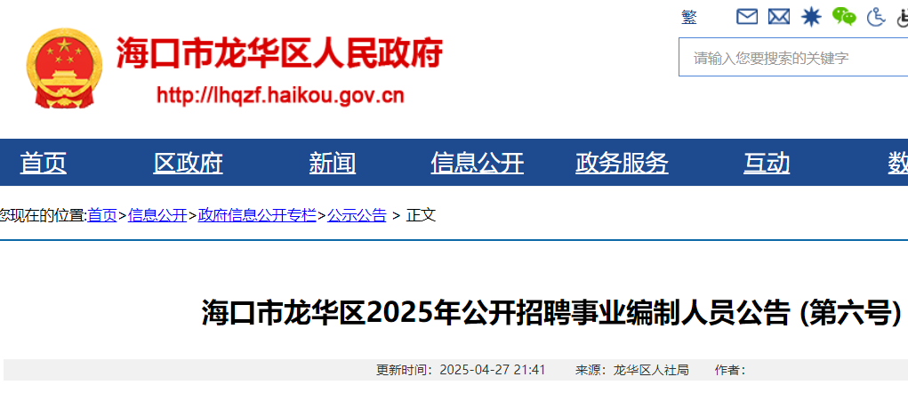 海口市龙华区2025年公开招聘事业编制人员面试工作领导小组办公室