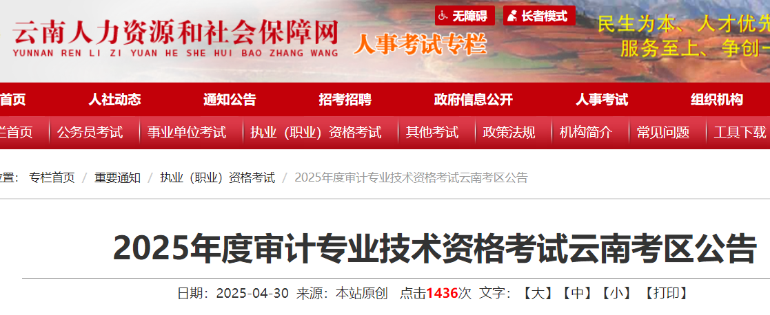 根据《审计署人力资源和社会保障部审计专业技术资格考试办公室关于2025年度审计专业技术资格考试工作有关事项的通知》(审考办字〔2025〕1号)精神,现将云南考区有关事项公告如下: