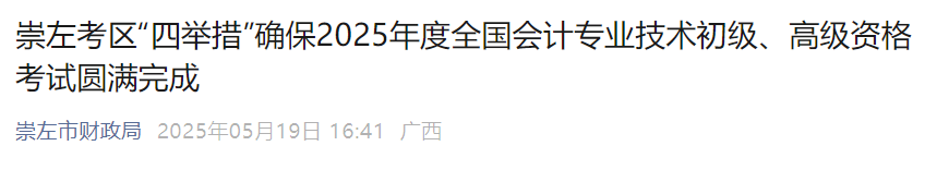 5月17-18日,全市2025年全国会计专业技术初、高级资格(崇左考区)考试圆满收官。考试期间,根据气象部门预报,5月18日崇左市将有中到大雨天气。