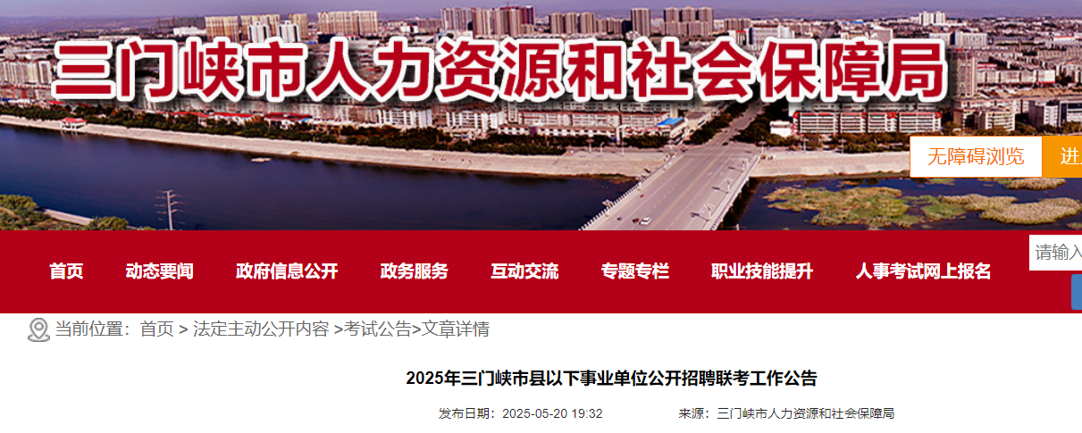 5月20日,全市县以下事业单位公开招聘联考公告在三门峡市人力资源和社会保障局网站(rsj.smx.gov.cn)和各县(市、区)工作专用网站进行发布。