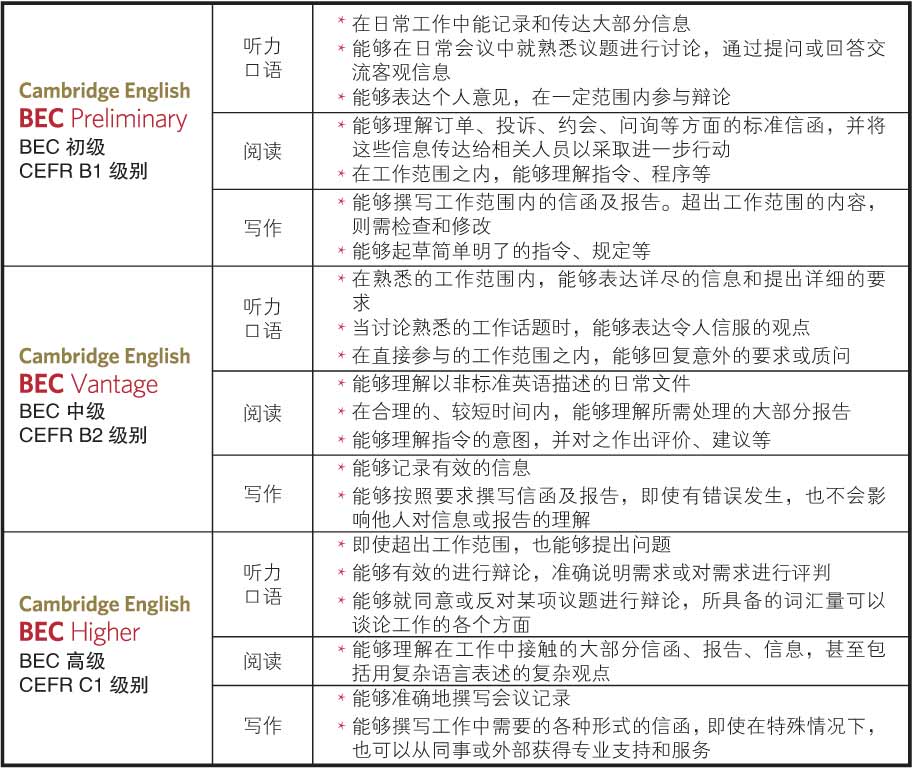BEC分为BEC Preliminary, BEC Vantage和BEC Higher由低至高三个级别。每个级别分别描述英语学习者所具备的听、说、读、写四项技能。