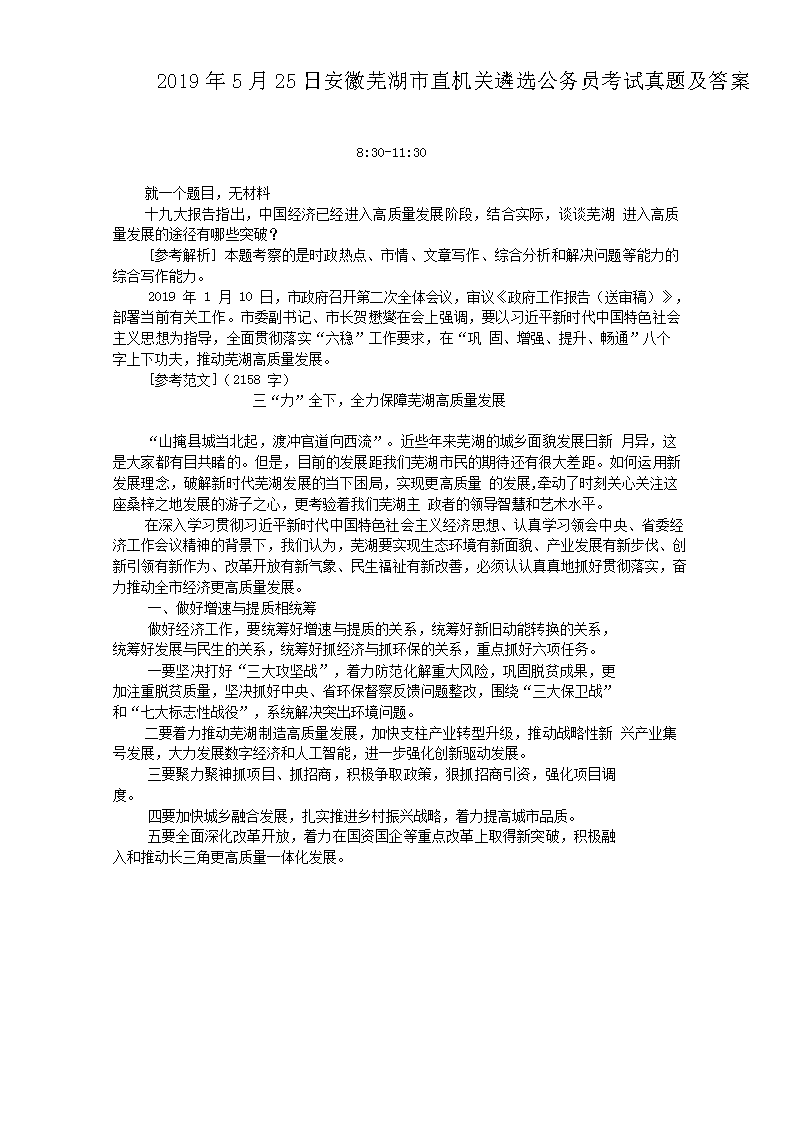 【文档名称】2019年5月25日安徽芜湖市直机关遴选公务员考试真题及答案(Word版)