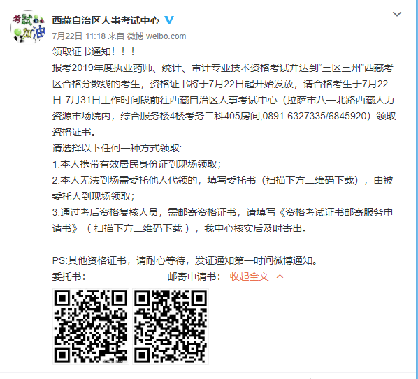 报考2019年度执业药师、统计、审计专业技术资格考试并达到“三区三州”西藏考区合格分数线的考生,资格证书将于7月22日起开始发放,请合格考生于7月22日-7月31日工作时间段前往西藏自治区人事考试中心(拉萨市八一北路西藏人力资源市场院内,综合服务楼4楼考务二科405房间,0891-6327335/6845920)领取资格证书。