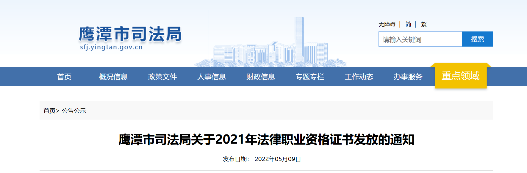 江西鹰潭关于2021年法律职业资格证书发放的通知
