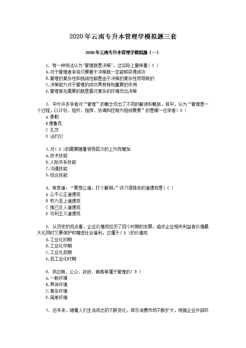 2020年云南专升本管理学模拟练习题三套(Word版)